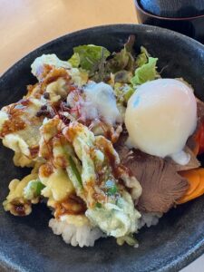 途中昼食で山菜天ぷらてんこ盛りのジビエ丼は美味しくて写真撮影。