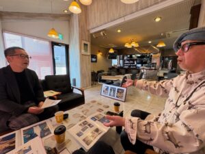 On the morning of March 12, we met with Mr. Teramoto, President of the Kumano Shimbun, at the hotel lounge in Shingu.