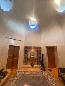 音楽ホールは、漆喰壁に美濃和紙、檜の床下に炭が敷き詰め、玄関には水晶が敷き詰められた水琴窟が配置される等、神仏が集まりやすいよう完全設計されています。西陣作品のお浄めにこの場で、持参したハンドパンを演奏したところ、天窓から強烈な光が差し込みました。