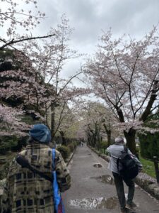 The cherry blossoms by the shrine exit were still beautiful even as they began to fall, and we took a commemorative photo on the carpet of petals. It was a refreshing start to the morning, leaving us feeling purified.