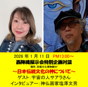 The efforts of Nishijin International Museum and Tomiya Textiles to tackle challenging mystical paintings for survival embody the strong curiosity that drove the Japanese of old to discover new things. This dialogue is a project designed to support that effort. The theme is “The Gods of Japan’s Traditional Culture” The source that gives birth to Japan’s traditional culture lies in the Japanese spirit, and to speak of it requires analysis from a cosmic perspective. Artist Fumio Shiozawa selected Ms. Saara, who possesses cosmic memories, as a guest. He planned this event to view Japanese culture from a fresh perspective, hoping more Japanese people would listen and awaken to their own roots.